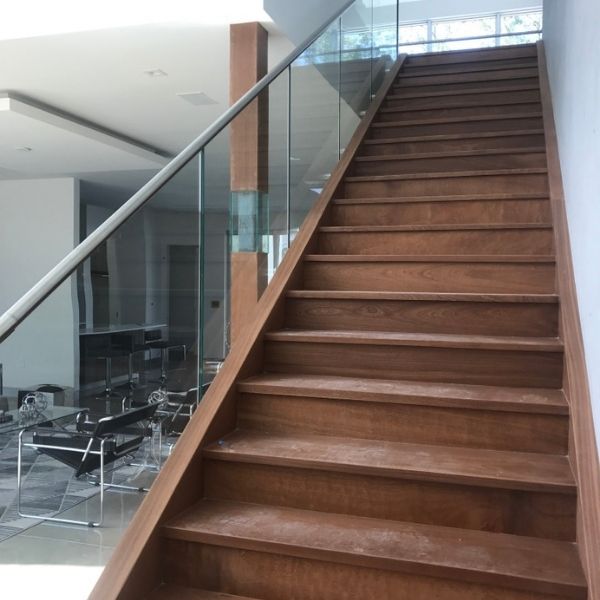 Wood treads are often paired with stainless steel or glass railings for a modern contrast between natural and industrial elements. Each tread is engineered for durability, slip resistance, and long-lasting performance.